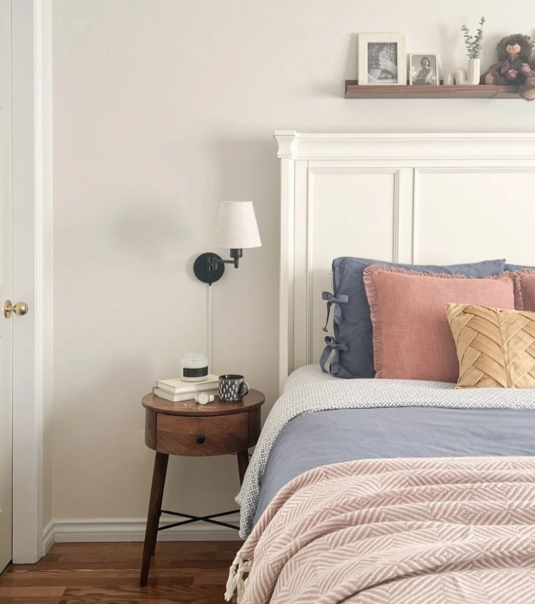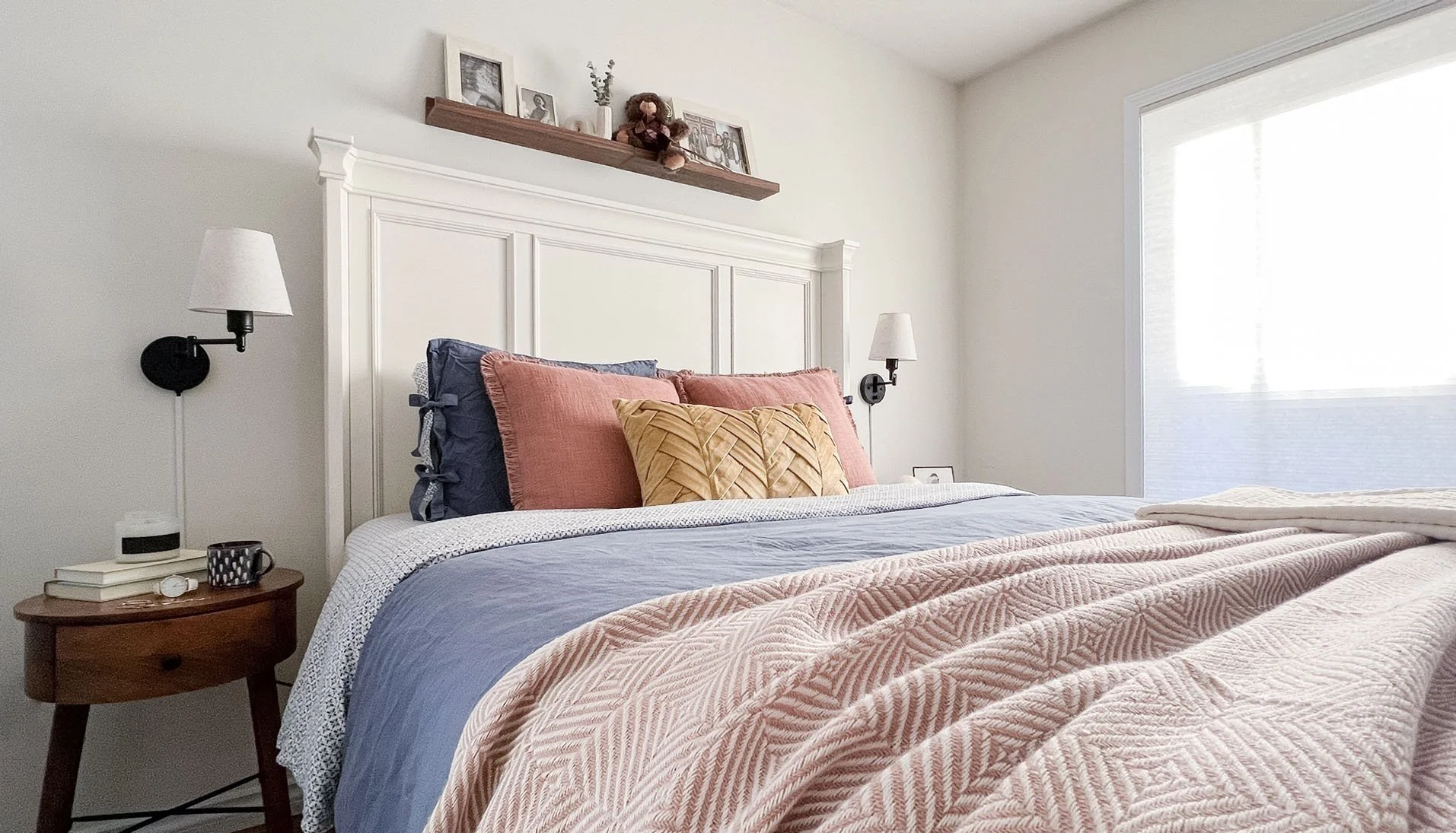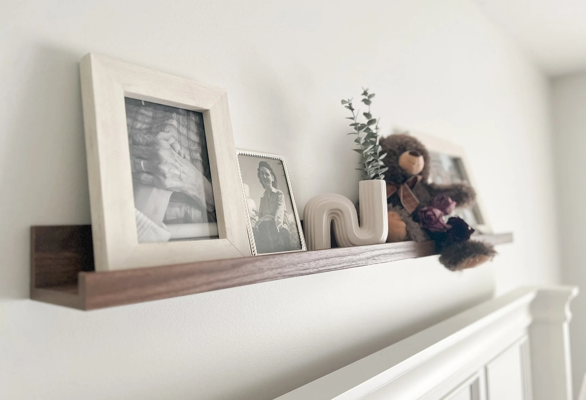 Anya wanted somewhere to display photos and sentimental items, so I added two picture ledges over the headboard. Picture ledges can be expensive, but IKEA has several affordable options (I picked up two Mosslandas for $10 each). Choose a finish that matches the other whites or wood tones in your space.