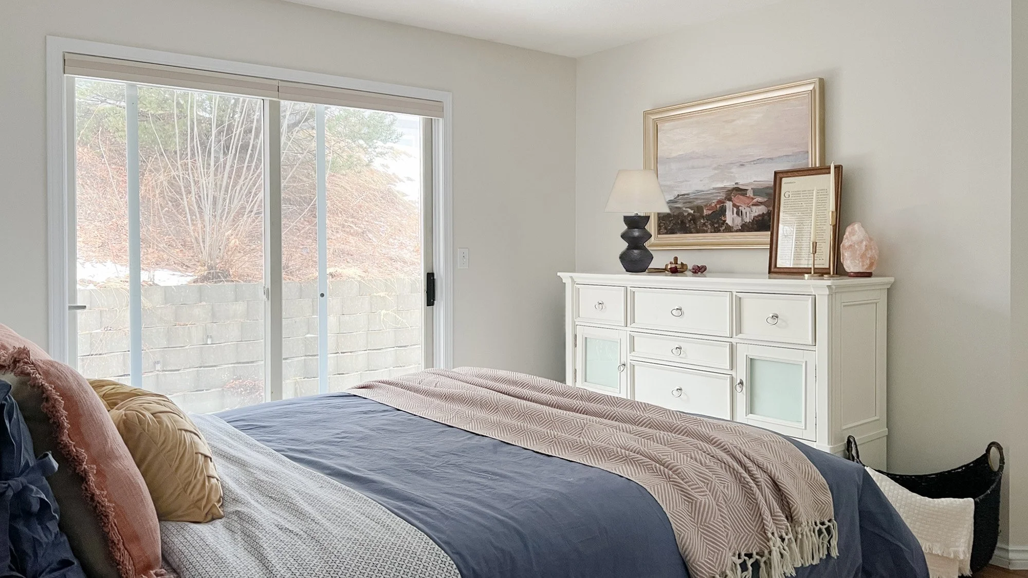 My lovely client Anya hadn’t done much with the bedroom since moving into her first home. She wanted to keep her furniture and light fixture, continue with a blue colour scheme, and make things more comfortable for her partner Amit who had since moved in. She also wanted to keep all the updates under $1000.