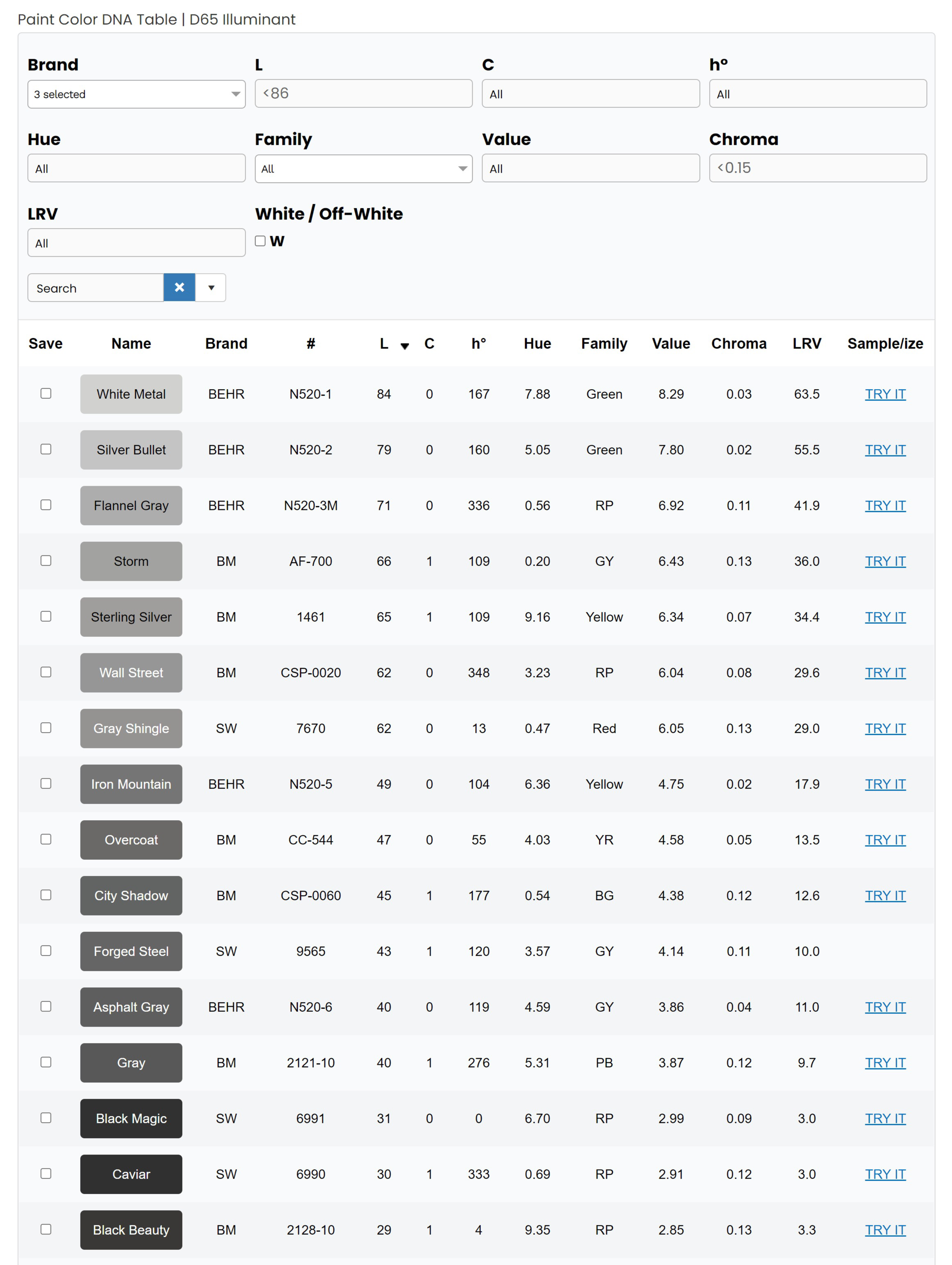 You should always compare colours with similar values (lightness/darkness) for the most accurate results, so I’ve included a range of near-neutral greys in the screenshot below, courtesy of the Paint Color DNA Table over at the Land of Color!
