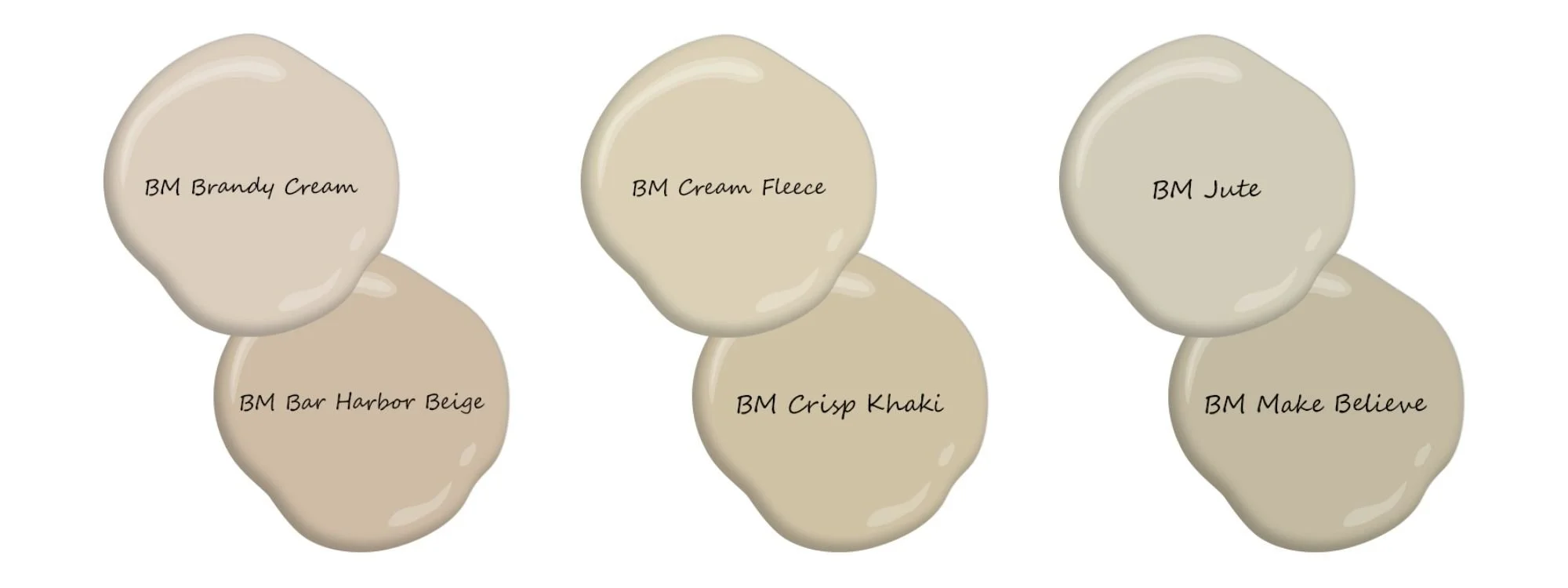 Beiges like Brandy Cream / Bar Harbor Beige are quite pink and should only be used when your fixed finishes require it. Beiges like Cream Fleece / Crisp Khaki are fairly balanced. Anything cooler than Jute / Make Believe would be firmly in the “greige” category.