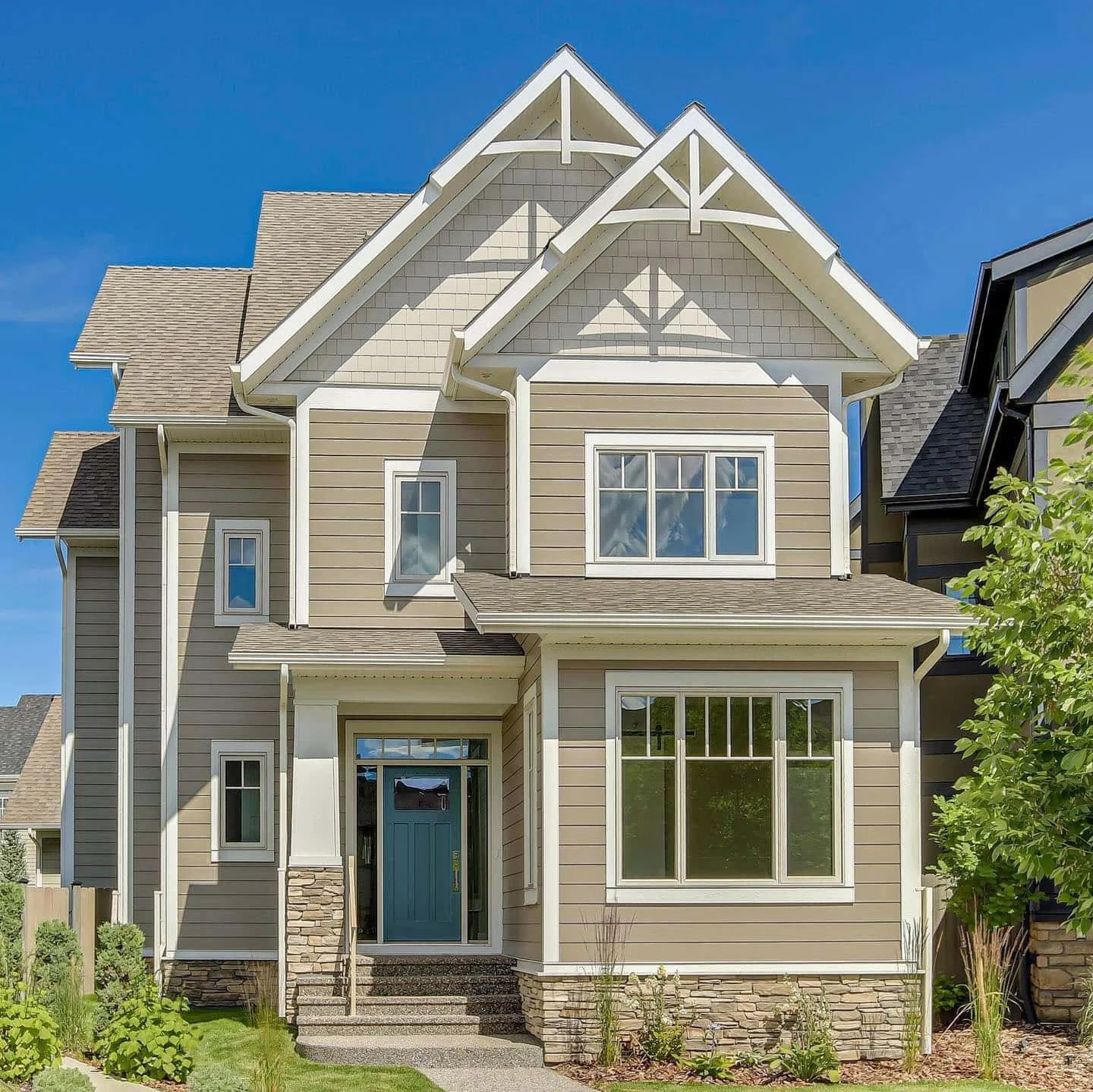 That said, if you’re working with earthy, green-grey stone, Monterey Taupe may suit your home beautifully. Notice how well coordinated the stone, siding, and front door are in the image above. (However, the white trim is too stark. Cobblestone trim (if available) would be better, or a custom colour.)