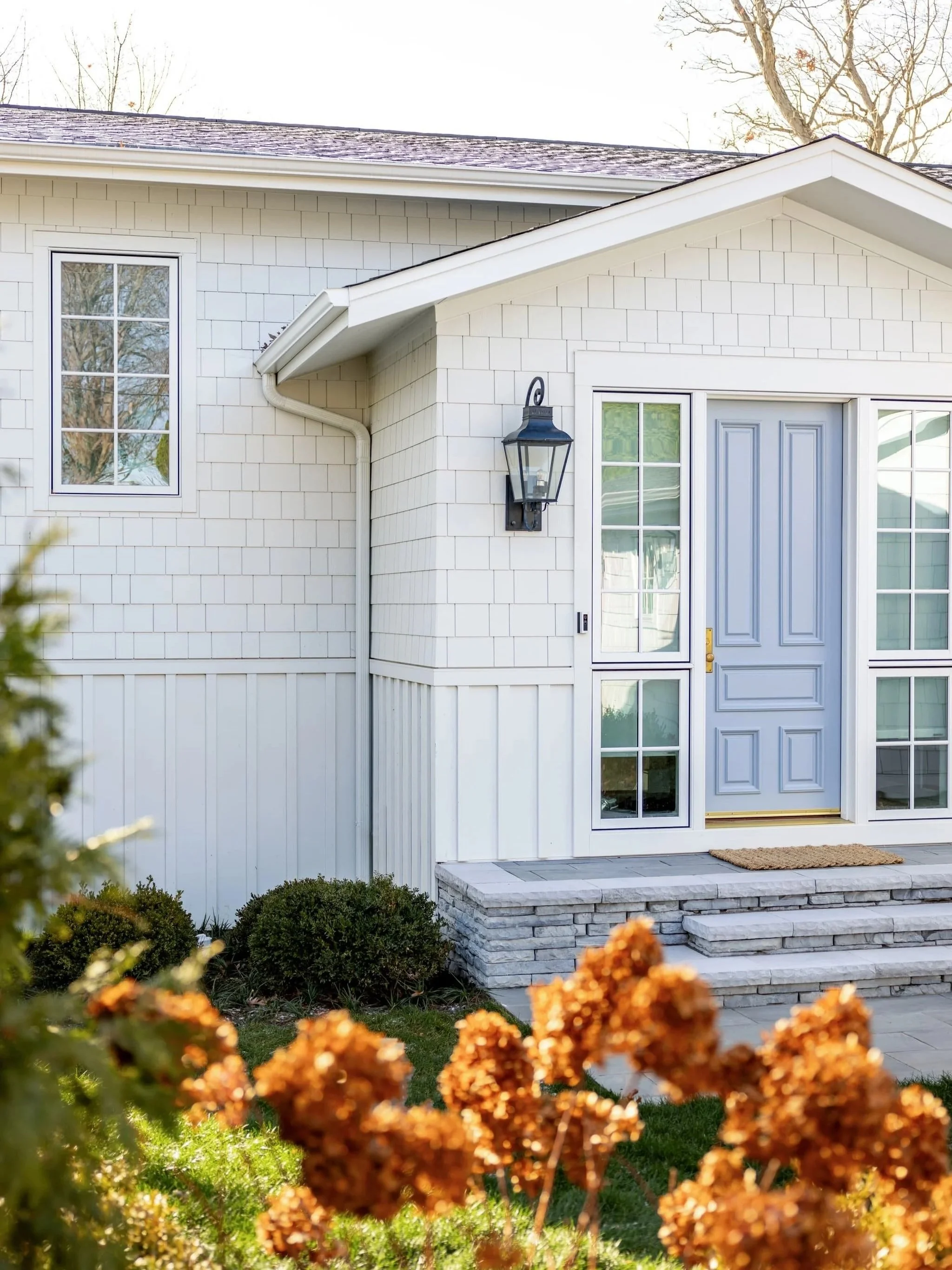 Because it’s so muted and earthy, Monterey Taupe will limit your front door and accent colour options to earth tones. Notice how this home seems to clash with the flowers because they’re so much brighter and more colourful?
