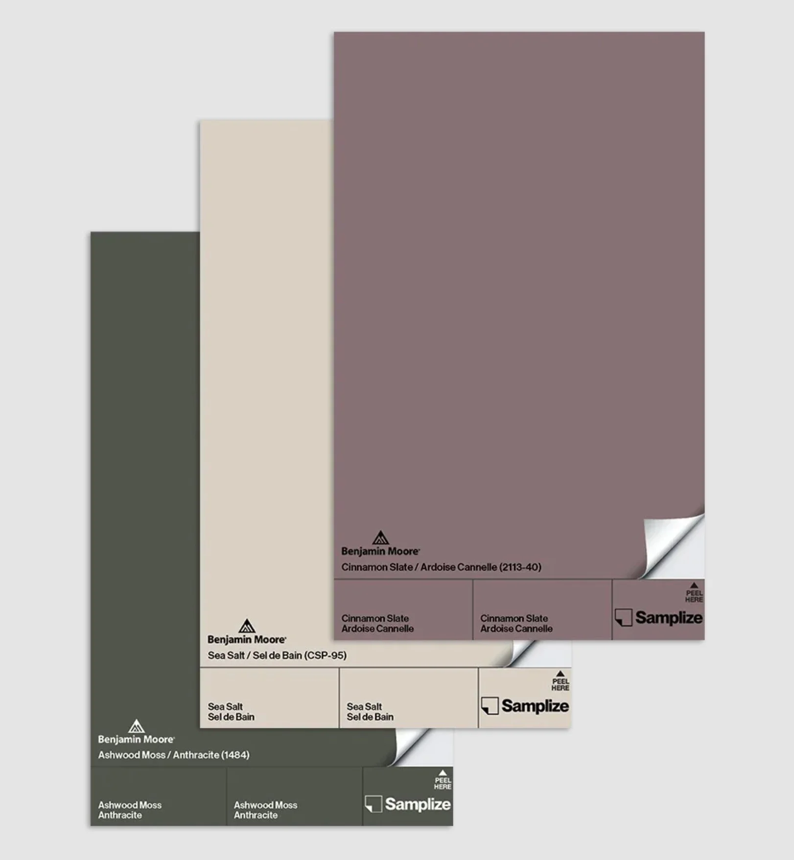 Little paint chips from the store are not adequate — they’re simply too small to provide an accurate sense of the colour. Once you’ve narrowed your selection down, you can order large peel and stick samples directly from Benjamin Moore and Sherwin Williams, or from a third party like Hello Paint (CA) or Samplize (US).